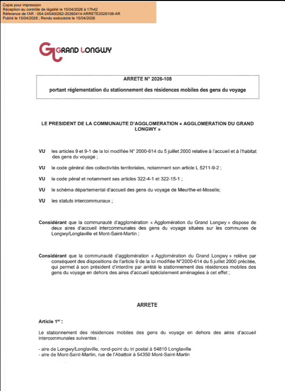 Considérant que la communauté d’agglomération « Agglomération du grand Longwy » dispose de deux aires d’accueil intercommunales des gens du voyage situées sur les communes de Longwy/Longlaville et Mont-Saint-Martin ;